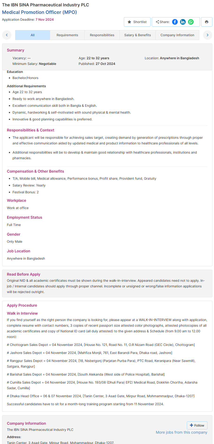 IBN SINA Pharmaceutical Job Circular 2024 has been published by the authority. IBN SINA Pharmaceutical’s resignation is in many categories. It’s a huge opportunity for unemployed people, Who want to do in this sector. IBN SINA Pharmaceutical is the most valuable part of our country. This is one of the most popular pharmaceuticals company in Bangladesh. With the job chances in IBN SINA Pharmaceutical, anyone can take this opportunity.