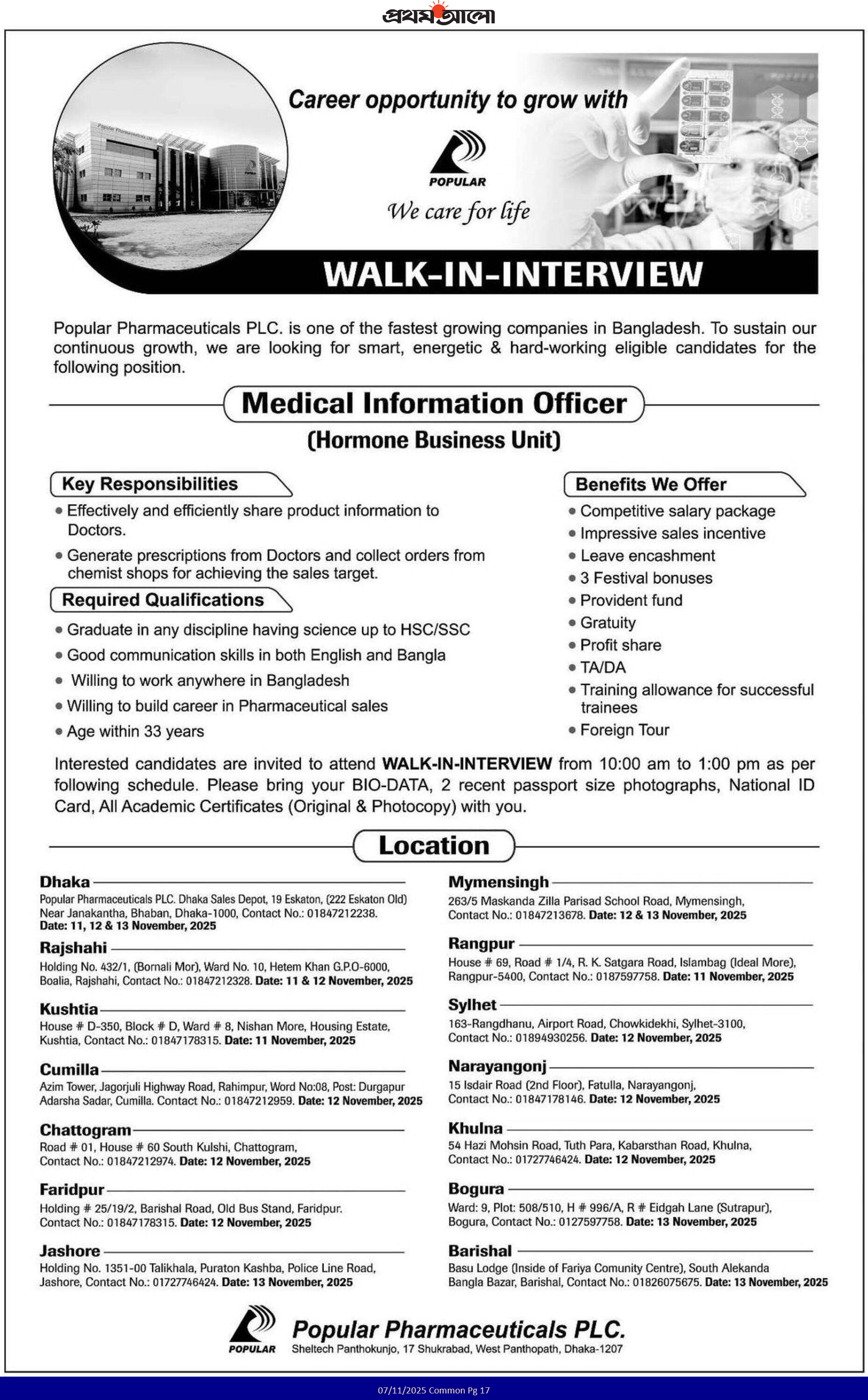 Popular Pharmaceuticals Ltd Job Circular 2025